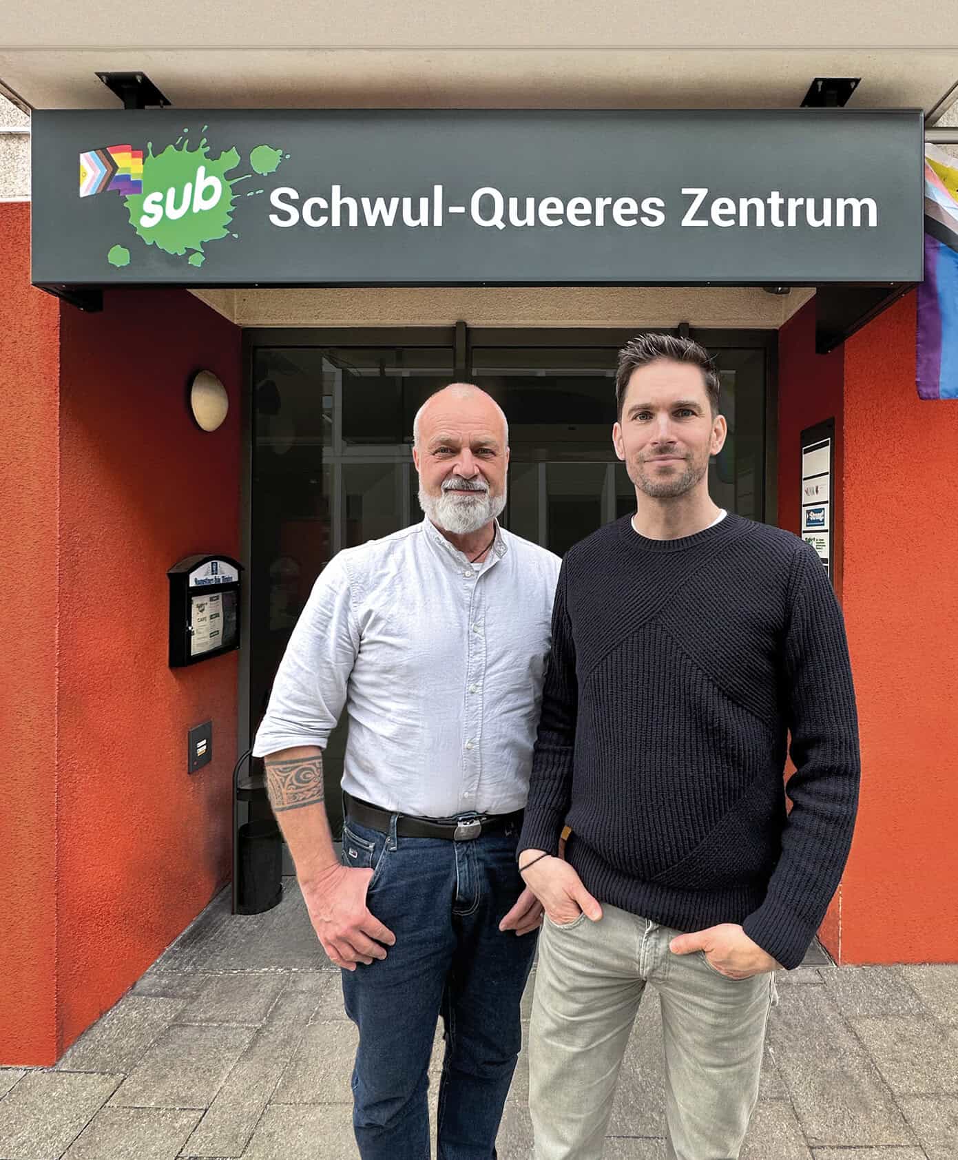 Über dem Haupteingang des Sub in der Müllerstraße 14 hängt seit 2024 ein neues Schild. Davor: Christopher Knoll (l.) von der Sub-Beratungsstelle und Sub-Geschäftsführer Dr. Kai Kundrath. Foto: Frank Zuber